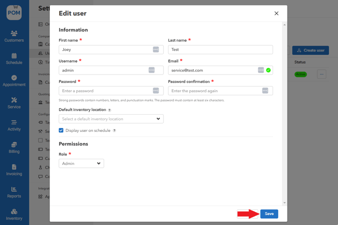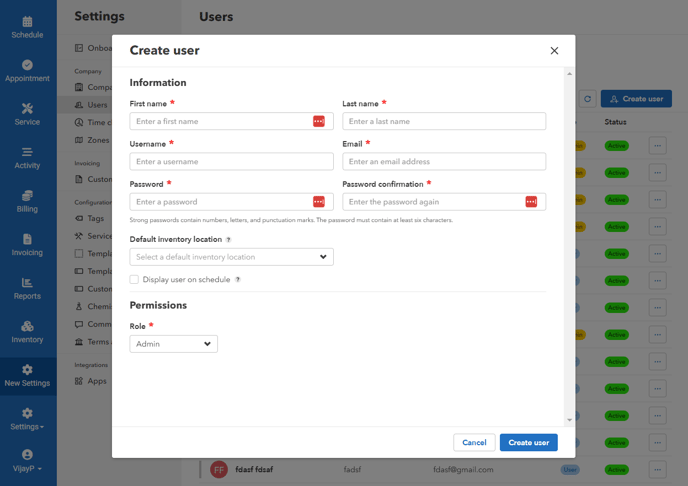 - Input user information > First name, Last name, Username, Email, and Default Inventory Location.