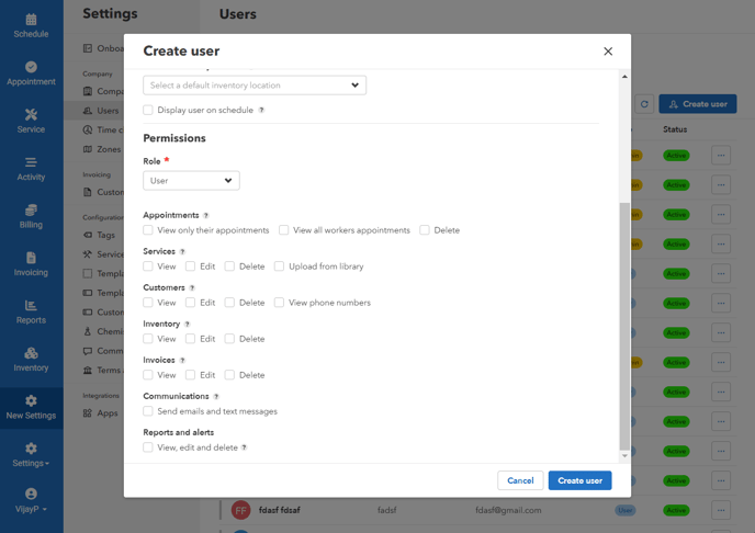 User - Provides limited access. You can customize the user's permissions by checking or unchecking the boxes next to each feature. - Once you have selected the role and customized permissions, click the "Create User" button.