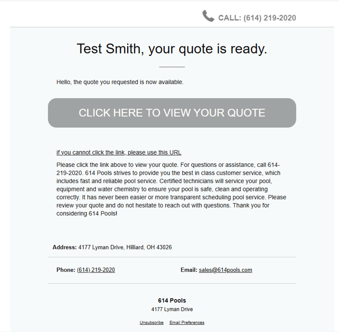 Emails will be sent from your designated sales email address and will feature your company logo. When a customer receives the quote email, they will want to click the button "Click Here to View Your Quote."