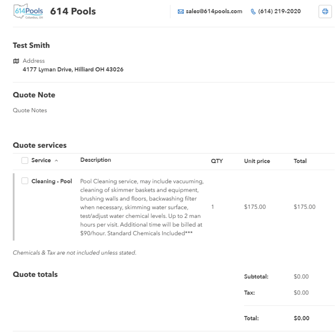 The customer will be redirected to the quote with pricing. The quote will feature items with checkboxes, allowing the customer to select which services and items they would like. The quote will include a section below the customer details where any added notes are displayed.