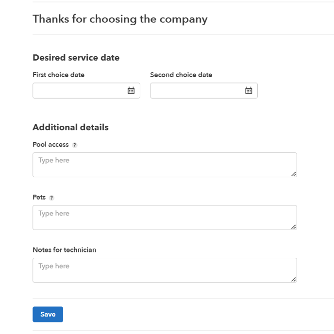 The next page seen is an optional form to collect details about the quoted services.