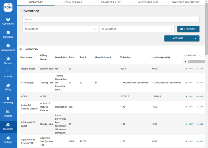 Inventory section also displays key information for each item, including the Item Name, Billing Name, a Description, Price, Part #, Manufacturer #, Global Qty (total quantity across all locations), and Location Quantity (quantity at a specific location).