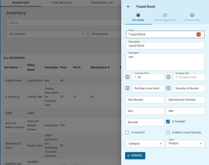 Click "Edit" to make changes to the item's details or to transfer a specific item between locations. Click "Update" to confirm changes.