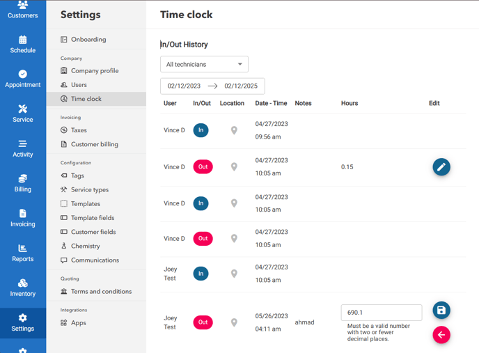 Managers can access the hours of a specific technician by navigating to Settings > Time Clock. If adjustments to the recorded hours are needed, managers have the ability to edit them as required.